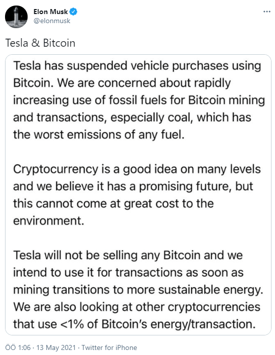 Olayları daha iyi analiz edebilmek için en başa dönelim, Tesla şirketinin yöneticisi Elon Musk, Twitter’dan yaptığı açıklamalar ile kripto para borsasını manipüle etmekle gündeme geliyordu. Musk, Mart ayında bitcoin karşılığında araba satışı yapılacağını açıklamış ve satışa başlatmıştı. Amerika’nın önde gelen finans ve istatistik şirketleri bu satış yönteminin Tesla‘ya para ve itibar kaybettireceğini belirtmiş, analizler yapmıştı.