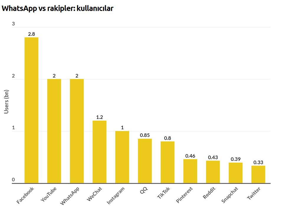 2009 yılından kurulan WhatsApp; her gün 100 milyondan fazla mesajın atıldığı devasa bir platformdur. İnternet kullanıcılarının (Çin hariç) %69’u WhatsApp kullanmaktadır. WhatsApp 180 ülkede, 60 farklı dilde mevcuttur.
